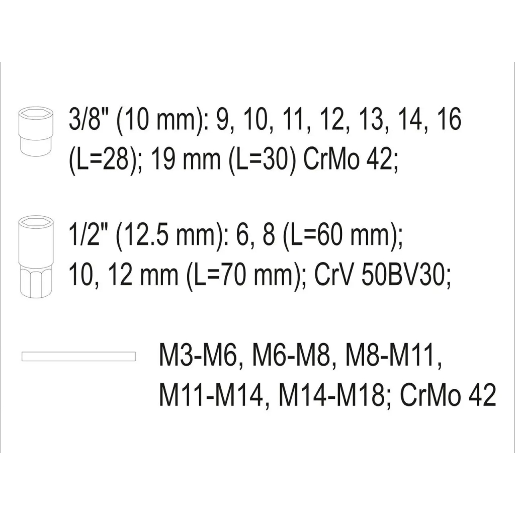 Короткий опис: Тип - спіральні, Кількість екстракторів, шт - 5, Розміри витягуваних гвинтів - M3-6, M6-8, M8-11, M11-14, M14-18, сталь, пластиковий кейс