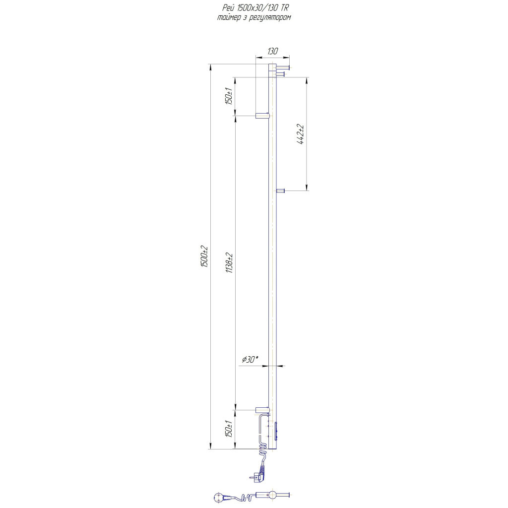 Короткий опис: електричний, трубка, нижнє, 50 Вт, 55 °C, IP44, нержавіюча сталь, 1500 мм, 130 мм, 30 мм