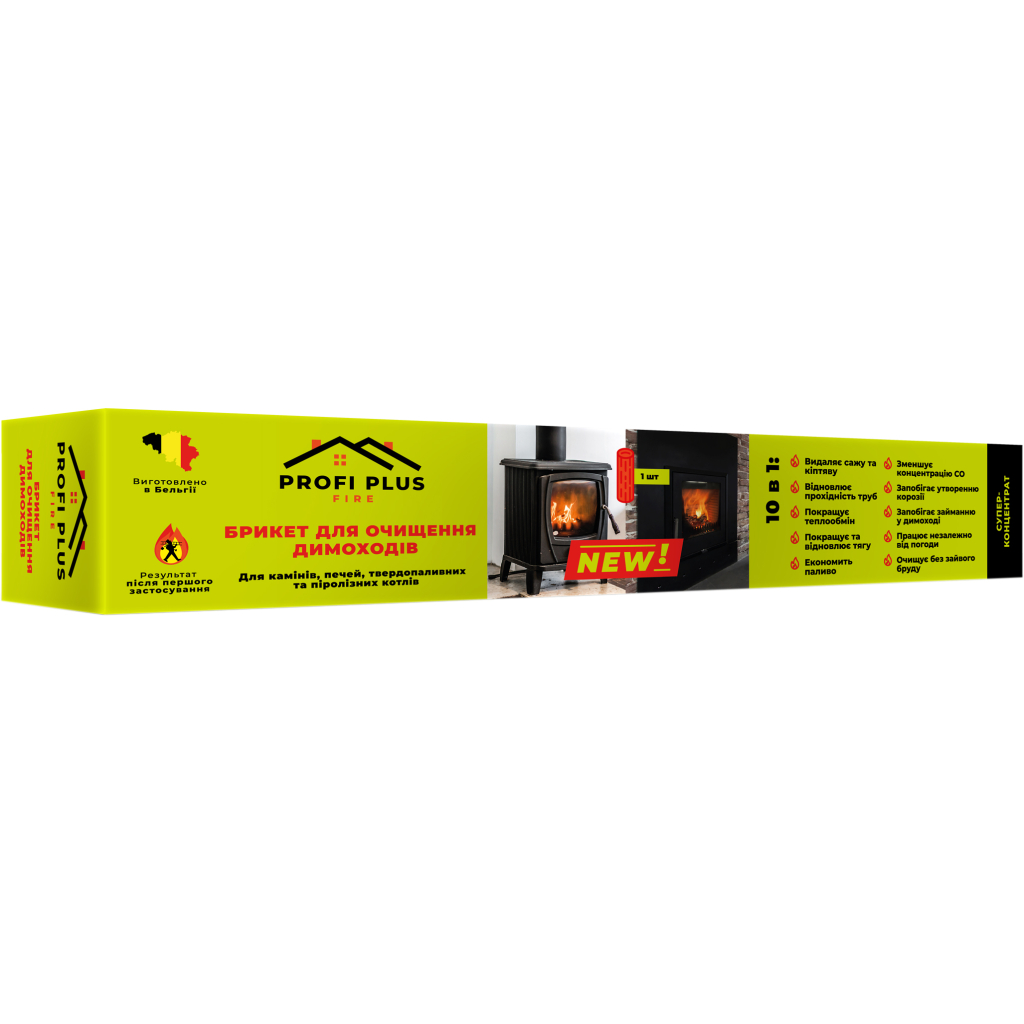 Брикет для очищення димоходів Profi Plus Fire — пресований, з деревної тирси, наповнений сумішшю хімічних реагентів для видалення креозоту та сажі в димоходах, трубах й інших важкодоступних місцях опалювальної системи. Засіб руйнує всі смолисті нашарування: легкі частинки легко видуваються з димом, а важкі падають вниз, після чого їх легко можна прибрати разом із золою. Підібрана формула ефективно справляється з найскладнішими забрудненнями і відновлює прохідність у трубах, покращує теплообмін, запобігає утворенню корозії, зменшує концентрацію чадного газу та запобігає запаленню в димоході. А також істотно заощаджує витрати палива. Рекомендується використовувати один брикет на початку опалювального сезону для профілактики та після завершення сезону для видалення всіх клейких залишків.